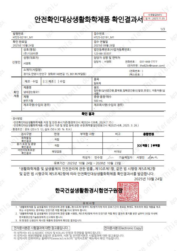 인증서 액상 KCL 성적서 페이지 정보 작성자 관리자 댓글 0건 조회 48회 작성일 25-11-20 15:02 목록 본문 액상 KCL 성적서 이전글트릴메틸아민 성적서 25.11.20 다음글안전기준 적합확인 신고증명서 25.11.20 댓글 0 댓글목록 등록된 댓글이 없습니다.